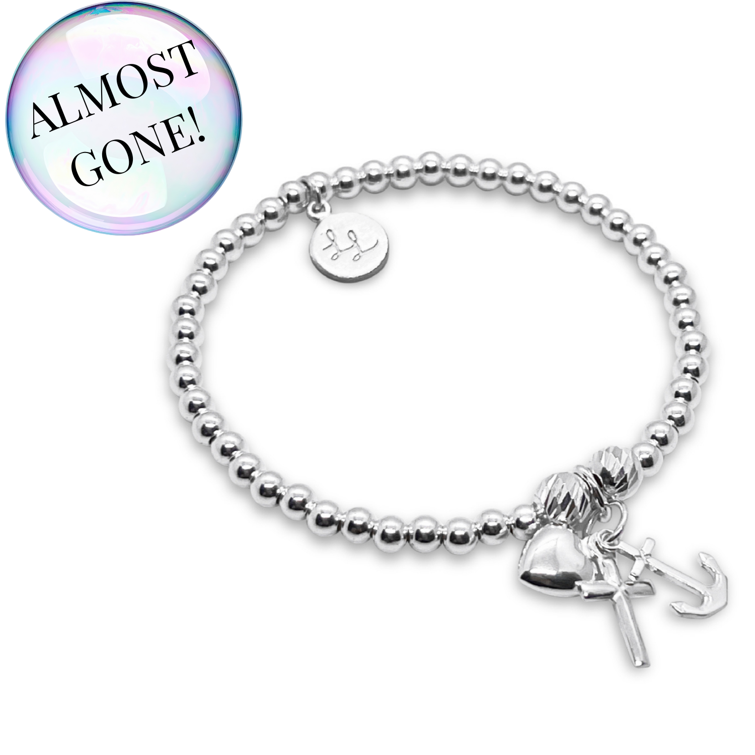Olivia is made from Sterling Silver 4mm round beads with a heart charm for love, a cross for faith and an anchor for charity.