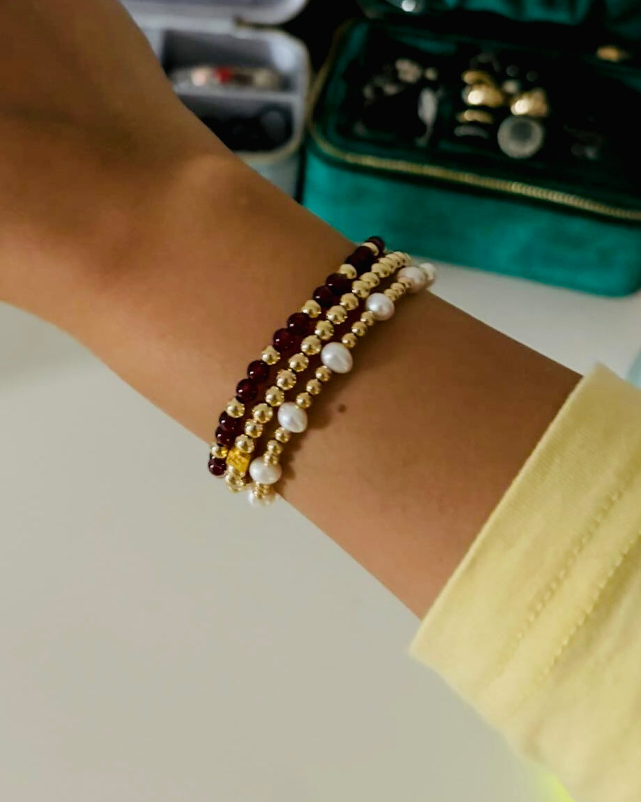 Handcrafted with gorgeous Garnet stones (the red beauties said to spark love, energy, and protection) and medium-sized beads in your choice of Sterling Silver or Gold Filled, this bracelet brings instant elegance with zero fuss—no charms needed. Feeling extra? Stack it with your other favs for a layered look that’s totally you. Finished with our signature LL logo tag and presented in our chic LL Loves box, it’s ready to shine—just like you.