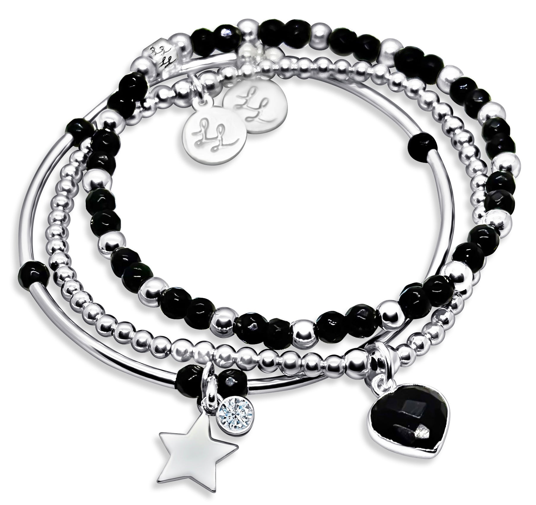 Three gorgeous bracelets, handcrafted with Sterling Silver and semi-precious Black Onyx, designed to make your wrist shine and your heart feel grounded. This set features a black onyx heart, a sparkling crystal, and a silver star—each piece carrying meaning and magic.